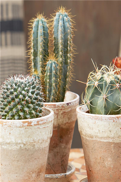 Ein Muss im Trend "INCA" sind Kakteen (Cactaceae). Sie sind echte Urgesteine, zäh und doch so vielfältig in ihren auffälligen Formen und Blüten. Die Pflanzen stehen gerne hell und kommen sehr gut mit voller Sonneneinstrahlung zurecht.