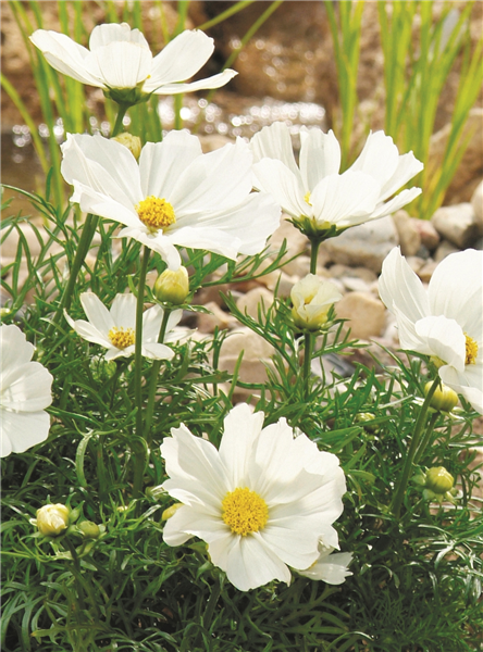 Auf langen, schlanken Stielen tanzen die seidigen Blüten des SCHMUCKKÖRBCHENS (Cosmos bipinnatus) in Weiß, Rosa oder kräftigem Pink über dem fein gefiederten Laub und bringen ordentlich Bewegung ins Beet. Am wohlsten fühlt es sich an einem vollsonnigen Platz mit lockerem, eher magerem Boden. Werden verblühte Köpfe regelmäßig entfernt, zeigt es über viele Sommerwochen hinweg immer neue Blüten. Besonders nachhaltig: Das Schmuckkörbchen sät sich häufig selbst aus und erscheint im nächsten Jahr überraschend wieder.