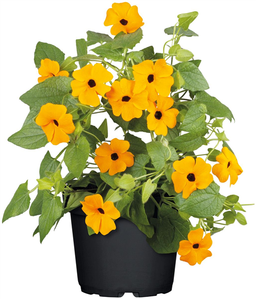 Die SCHWARZäUGIGE SUSANNE (Thunbergia alata) wächst zügig in die Höhe und verwandelt Geländer, Rankstäbe oder Spaliere innerhalb weniger Wochen in eine blühende Kulisse. Ihre leuchtenden Blüten, je nach Sorte in Goldgelb, Orange, Rosa, Rot oder Creme, verleihen dem Balkon eine warme, fast mediterrane Ausstrahlung. Viel Licht fördert eine kräftige Triebentwicklung und eine reiche Blüte. Damit sie ihr Wachstum halten kann, braucht sie regelmäßige Wassergaben und eine kontinuierliche Nährstoffversorgung. Das Substrat sollte locker sein, sodass überschüssige Feuchtigkeit gut abfließen kann.