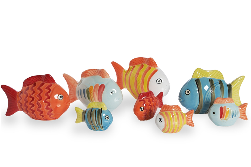 Die SCHWIMM-FISCHE aus Porzellan bringen mit leuchtenden Farben und verspielten Mustern Bewegung in Mini-Wasseroasen oder Schalen. Ob gestreift, in Türkis, Koralle oder Sonnengelb – jeder wirkt wie ein kleines Unikat. Besonders in flachen Wasserscha-len