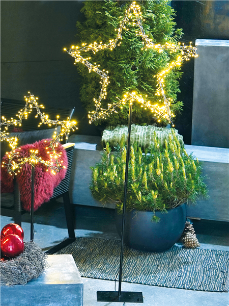 Ob als Gartenstecker, im Pflanzgefäß oder als hoher Stern auf Fuss – die leuchtenden LED-Sterne aus stilvollem, schwarzem Metall setzen funkelnde Akzente in der dunklen Jahreszeit. Mit ihren 150 warmweißen Lichtern schaffen sie eine festliche Atmosphäre und bringen wintergrünes Laub besonders schön zum Strahlen. Dank Timer und praktischer Fernbedienung lassen sich die Sterne bequem steuern und sorgen so Abend für Abend für stimmungsvolles Licht im Garten, auf der Terrasse oder am Hauseingang. Die LED-Sterne am Fuß gibt es übrigens in zwei Größen. So finden sie bei jedem einen passenden Platz.