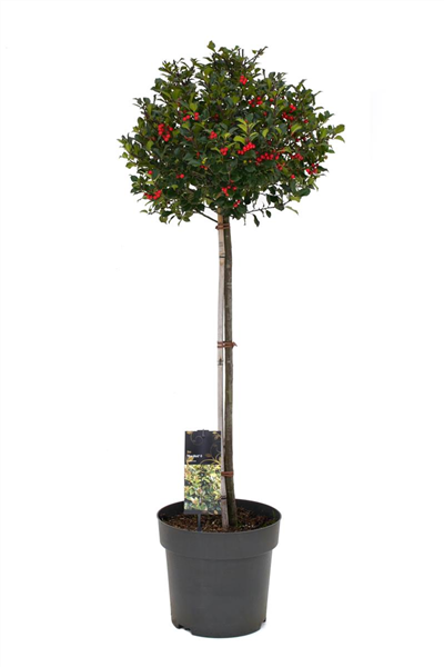 Das glänzend dunkle Laub des Stechpalmenstämmchens (Ilex meserveae 'Blue Maid') bleibt das ganze Jahr über attraktiv. Ab Herbst leuchten dazu die roten Beeren – ein schöner Kontrast zum Grün. Als Stämmchen wirkt es besonders dekorativ auf Terrasse oder am Hauseingang. Es wächst am besten an einem sonnigen bis halbschattigen Platz in durchlässiger, nährstoffreicher Erde, ist frosthart und pflegeleicht.
