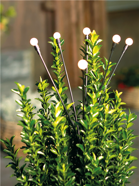 Mit den schlanken LED-Steckern lassen sich Pflanzen im Handumdrehen in stimmungsvolle Lichtobjekte verwandeln. Zwischen frischem Grün leuchten sechs kleine Kugeln in warm-weißem Licht und sorgen für eine einladende Atmosphäre – ob auf Balkon, Terrasse oder im Garten. Durch ihre schlichte Form fügen sich die Lichter dezent ein und setzen zugleich elegante Akzente, die besonders in den dunklen Wintermonaten für Gemütlichkeit sorgen.