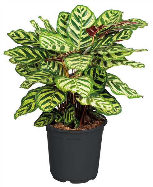 Die Korbmarante (Calathea) stammt aus den tropischen Regenwäldern Südamerikas und fasziniert durch ihre kunstvoll gemusterten Blätter in unterschiedlichen Grüntönen. Ihre Blätter schließen sich in den Abendstunden leicht zusammen, morgens öffnen sie sich wieder. Ein faszinierendes Merkmal, das ihr den Beinamen „Lebende Pflanze“ ein-gebracht hat. Sie gedeiht am besten an halbschattigen Standorten mit hoher Luftfeuchtigkeit und gleichmäßig feuchter Erde.
