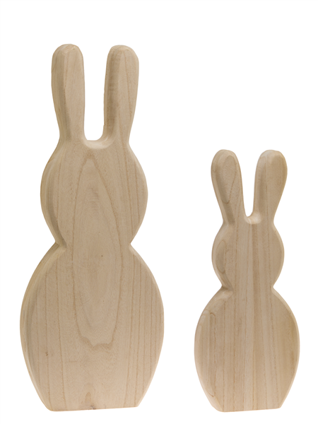 Schlicht und natürlich präsentieren sich die Hasen aus hellem Paulowniaholz. Ob einzeln oder als Duo arrangiert, fügen sie sich mühelos in frühlingshafte Dekorationen ein.