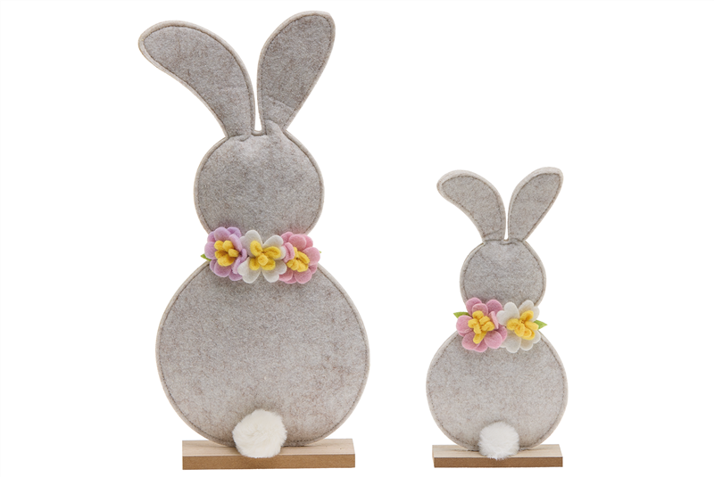 Hase zu Ostern? Auf jeden Fall! Auch wenn diese beiden nicht durchs Wohnzimmer hoppeln, finden sie auf Sideboards oder in Regalen ihren festen Platz. Die Filzoptik wirkt angenehm natürlich, während die kleinen Blütenkränze eine dezente Portion Frühlingsfreude einbringen. Als kleines Duo oder einzeln platziert ergänzen diese Hasen perfekt jede Osterdekoration.